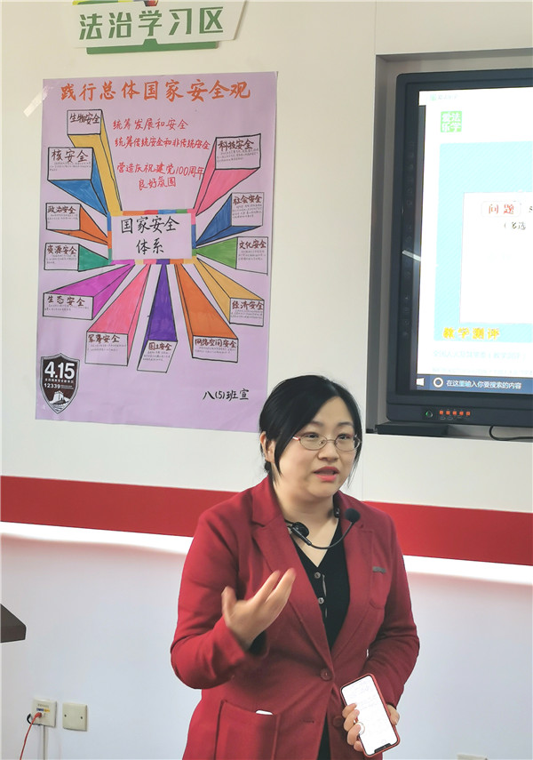該校通過基礎課程「走進來」、專題教育「請進來」、活動課程「走出去」三類平台,運用「愛法樂學」中小學法治課堂教學系統、AI互動課桌,開展一至九年級《道德與法治》課堂學習,並利用各類資源讓學生了解和樹立國家安全觀意識。