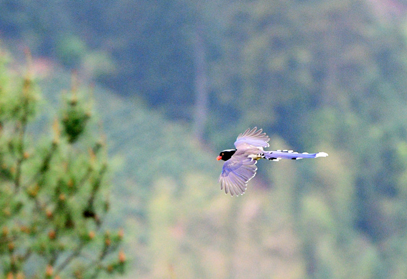4月15日,記者在安徽黃山市休寧縣璜尖鄉境內拍到一群紅嘴藍鵲有的在樹叢中跳躍嬉戲,有的在水潭邊飲水歡歌,空中滑翔的姿勢更是無比漂亮。