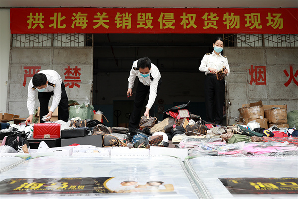 海關關員對侵權貨物進行銷毀。(俞波攝)