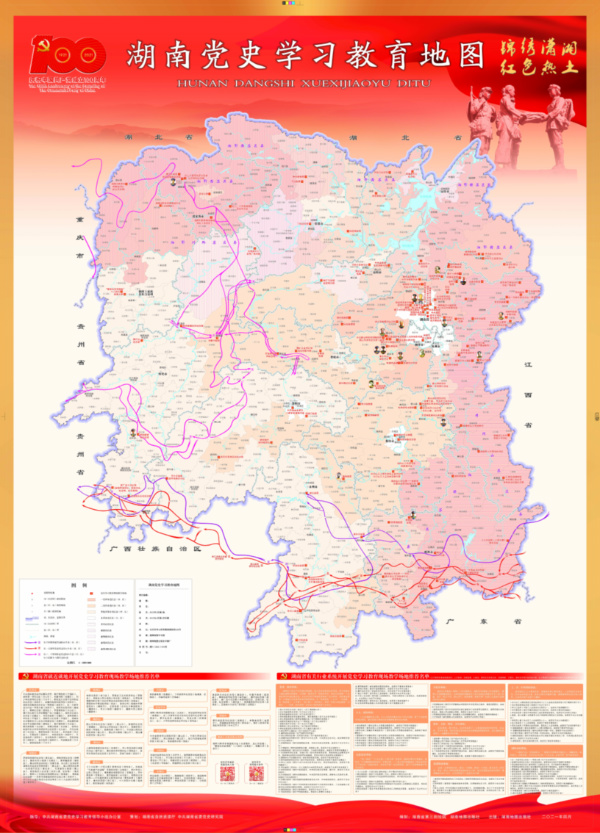據介紹,《湖南黨史學習教育地圖》以湖南省普通地圖為底板,嵌入人物、事件和紅色資源等要素,圖文並茂,直觀呈現重要黨史人物、重大事件和重要紅色遺蹟,着力勾勒紅色瀟湘最美模樣。該版地圖收集了建黨百年343位、397人次湘籍重要黨史人物簡介;建黨百年湖南重大事件120餘件、湖南重大黨史事件52件和解放後歷次代表會議、代表大會簡述18條;革命老區縣(市、區)104個;就近就地開展黨史學習教育現場教學場地推薦名單118處和有關行業系統開展黨史學習教育現場教學場地推薦名單89處;紅軍長征經過湖南線路圖,井岡山、湘鄂西、湘贛、湘鄂贛和湘鄂川黔五大革命根據地鬥爭形勢圖等圖件。