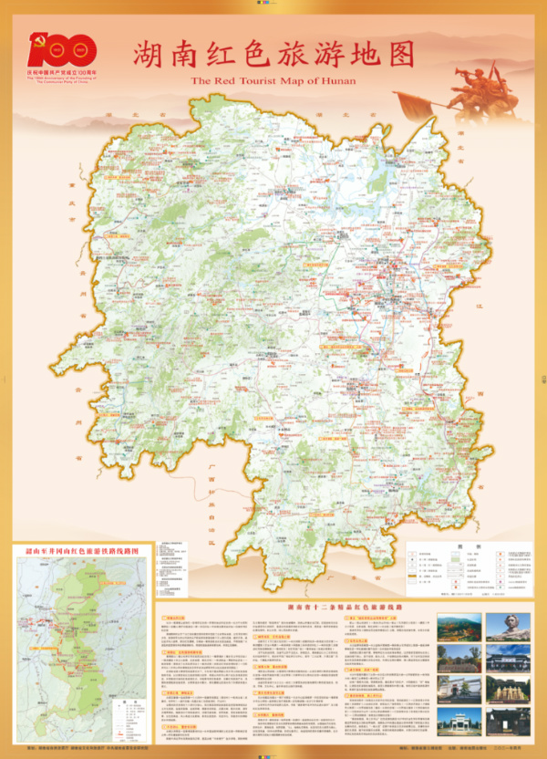 《湖南紅色旅遊地圖》以湖南省普通地圖為底板,嵌入各類紅色旅遊資源要素,確保「紅色旅遊一圖通」。該版地圖主要收集了紅色旅遊經典景區94個、革命類重點文物保護單位342個、愛國主義教育基地158處、重點黨性教育基地42處;建黨百年精品紅色旅遊線路12條;4星級以上旅遊景區146家;紅色旅遊景區圖文資料21份;韶山至井岡山紅色旅遊鐵路線路示意圖、1917年毛澤東與蕭子升遊學線路示意圖、1927年毛澤東考察湖南農民運動線路示意圖、湖南省旅遊資源圖等圖件,以及生態保護紅線等數據。(何雯)