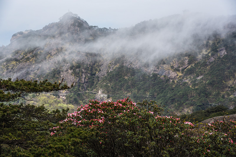每年的四月、五月,杜鵑花與黃山的約會總是如期而至。此時韶光正濃,在黃山之巔的玉屏樓、北海、西海、散花塢、信峰上,杜鵑花競相綻放、粉墨登場。朵朵花兒錯落有致點綴在整株杜鵑花的枝頭,奇芳絕豔,杏粉、梨白、殷紅,如同胭脂般綺麗無比。春風吹拂,花兒搖曳多姿,花香怡人。