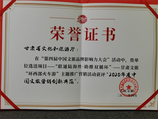 甘肅省文旅廳消息稱,4月23日於人民日報社舉辦的第四屆中國文旅品牌影響力大會上,由甘肅省文旅廳跨省聯袂組織的「聯通陸海絲·助推雙循環」——甘肅文旅「環西部火車游」主題推廣營銷活動獲評「2020年度中國文旅營銷創新典範」,敦煌研究院榮膺「2020中國文旅年度特別貢獻」。甘肅文旅王牌IP助力中國文旅品牌載譽前行再樹標杆立榜樣。