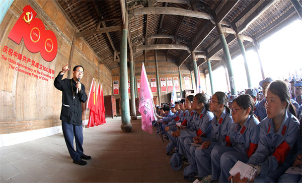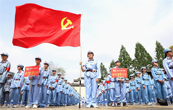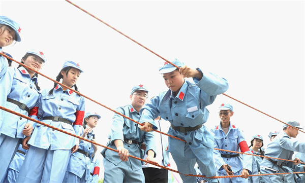 在開營儀式上,同學們穿著“紅軍”裝,集體宣誓“努力學習做一個革命接班人”,長大後要建設國防、守邊疆,參加集體大練兵,集中在紅色大講堂聆聽“紅軍長征故事”。