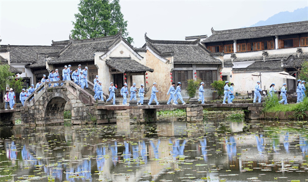 4月24日,安徽歙縣育鴻學校1500名中小學生到呈坎紅色研學基地開展“追溯紅色記憶,傳承徽州文化”研學活動,師生當“紅軍”四渡赤水,牢牢記住那段長征史。