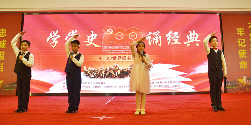 經典浸潤人生,誦讀彰顯魅力。經過前期的作品徵集,龍西社區在參選的60餘幅作品中選取了8個紅色經典節目予以集中上臺展示。4月23日晚上7點,讀書日活動在雄渾有力、氣宇軒昂的《少年英雄》武術表演中拉開了帷幕,來自甘棠小學和甘棠中心學校的200餘名小學生以飽滿的激情、鏗鏘有力的話語分別朗誦了《英雄》、《我的夢,中國夢》、《傳承中華經典、謳歌百年歷程》、《重上井岡山》、《中國紅》、《祖國啊,我親愛的祖國》等紅色經典,帶領全場觀眾重溫黨的崢嶸歲月,謳歌黨的百年豐功偉業,表達了對黨和國家的祝福和熱愛,點燃了在場每一位聽眾內心深處的愛國之情和報國之志。活動中還穿插了黨史知識問答,讓青少年們在誦讀經典的同時學習了黨史。