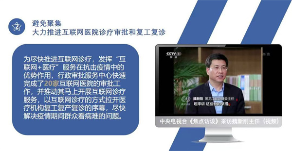 通過項目專班推動,省衛健委還對內部流轉環節進行了精簡,將原來涉及7個處室的行政許可事項統一在行政大廳現場審批,實現一站辦結。同時認真落實「五個減少」要求,梳理規範省市縣三級政務服務事項要素,確保無差別、同標準、同待遇辦理。依法減少行政許可事項申請材料,依法取消全部中介服務事項。開設政務服務旗艦店,將所有政務服務集成展現,同時增加了32項公共服務,方便指導企業辦事、查詢。全部政務服務事項實現網上辦理,並實現最多跑一次,60%行政許可事項和高頻事項實現當天及時辦理。企業特殊審批事項實現「我幫辦」,提供預約辦、延時辦等便民服務。推行承諾審批制度,非主審材料容缺後補。疫情期間,開闢互聯網醫院審批綠色通道,先後核發22家互聯網醫院許可,為疫情防控阻擊戰提供了有力保障。