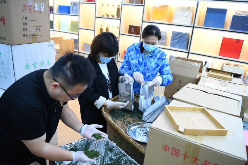 走訪了解,茶博城內部分商家也在積極變線下銷售為線上銷售,利用網絡、網群、直播等形式服務新老客戶。在一家主營六安瓜片的店裏,員工們正忙着分裝茶葉,打包發貨。據相關負責人介紹,目前銷售的平台主要有淘寶、京東旗艦店和抖音。