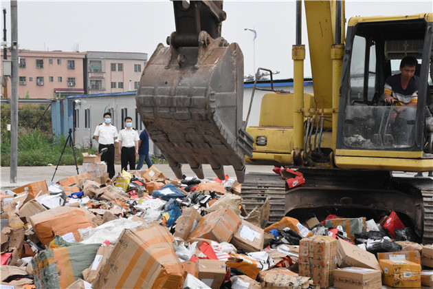4月13日,在位於廣州市的廣東變寶再生資源有限公司廠房內,1.5萬餘件侵權衣物和手機殼、充電器等手機配件被分批銷毀。4月20日,在位於佛山市的廣東安泰順貿易有限公司廠房內,4805件鞋帽箱包、高爾夫球杆、耳機等侵權商品也被銷毀。