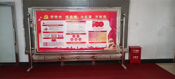 為加強系統黨員幹部對黨史學習教育的認識,局黨組設計製作別具城管特色,樣式新穎的黨史知識展板,懸掛在會議室、辦公樓進門大廳,並在學習園地展示黨史學習教育成果和工作經驗等,圖文並茂,豐富易懂,引人駐足,收穫頗豐,為黨史學習教育營造濃厚宣傳氛圍。