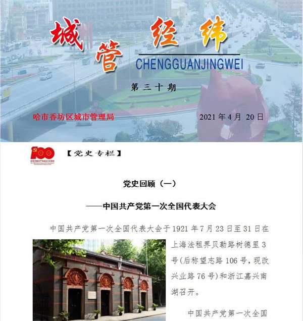 《城管經緯》是香坊區城管局刊發工作信息、經驗做法的宣傳陣地,主要在香坊區城管局系統各單位以及香坊區政府內部傳閱。為迎接建黨100周年,城管局在《城管經緯》新開闢《黨史專欄》,宣講黨史知識,刊登黨史學習教育動態,進一步提升黨員幹部的學習效果。
