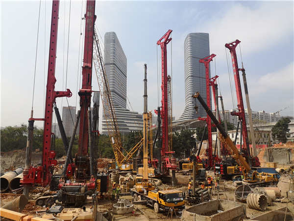 記者在新塘綜合交通樞紐一標段施工現場看到,約5000平方米的施工場地內,25台大型設備、200餘名工人正有序作業。