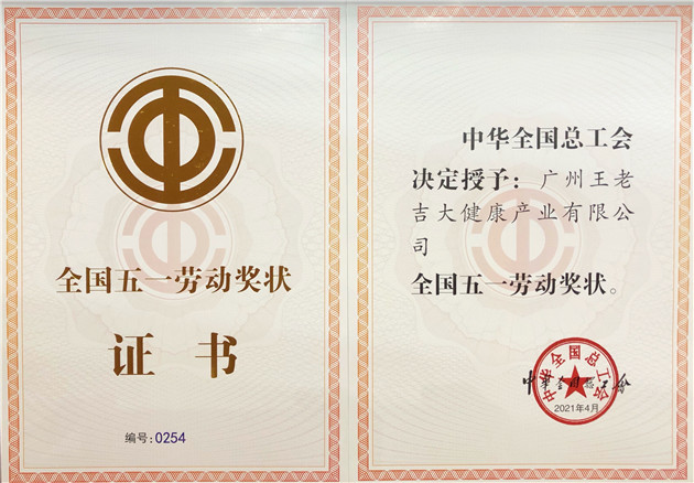 王老吉大健康榮獲2021年「全國五一勞動獎狀」