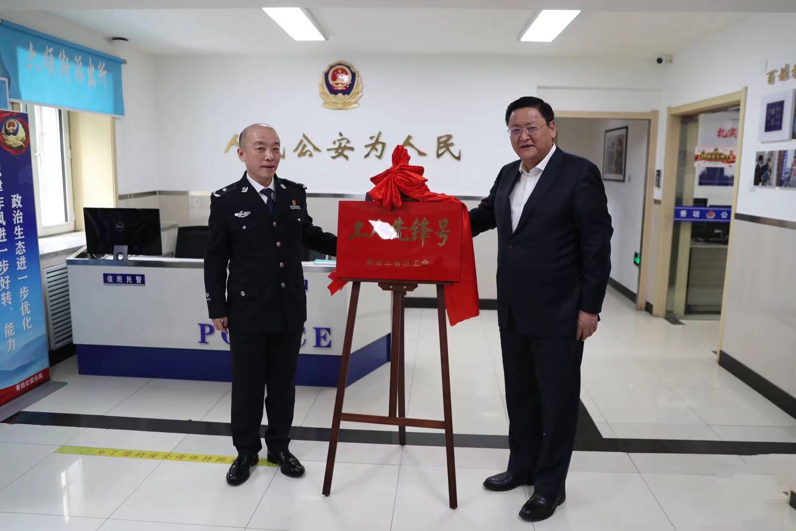 4月29日,香坊區委書記譚樂偉,區委常委、區政法委書記黃湘龍,副區長、區公安分局局長肖景濤等區領導為香坊分局六順街派出所「黑龍江省工人先鋒號」揭牌,並親切慰問一線公安幹警。「工人先鋒號」的授予,充分展現政法隊伍忠誠履職、為民服務、擔當作為的時代風采,在六順街派出所唱響勞動光榮主旋律,匯聚正能量。
