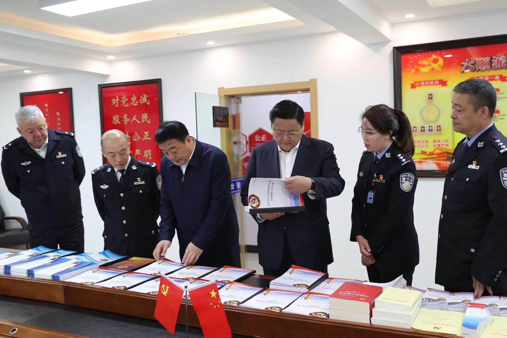 譚樂偉一行參觀了所隊展廳和黨建長廊,指出六順街派出所以傳承紅色基因為己任,弘揚政法英模精神,是一支作風硬朗、紀律嚴明的公安隊伍。省「工人先鋒號」榮譽名副其實,2021年被公安部授予集體一等功;在檢查黨史學習教育和政法隊伍教育整頓台賬及學習筆記時,譚樂偉充分肯定了工作實、細、標準高。指出要堅持被查從嚴,自查從寬的原則,確保工作精準到位;在「服務百姓保平安」為主題的展板前,譚樂偉一行聽取了「離群眾最近、對群眾最親、保群眾平安」的工作介紹後,指出六順街派出所黨史學習教育活動開展的切合實際,與「我為群眾辦實事」緊密結合,真正做到為百姓辦實事、做好事、解難事。