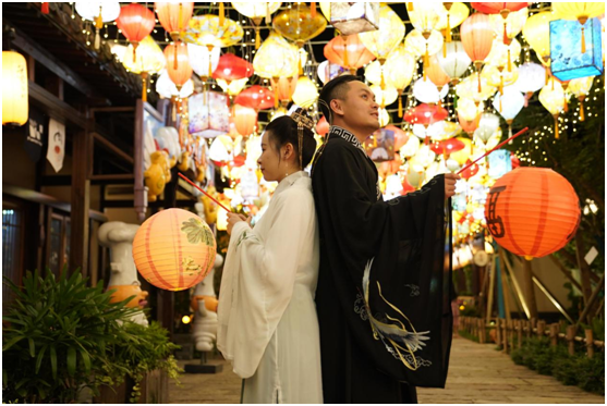 “夜晚穿著漢服走在古樸的街道,仿佛是在參加古代的燈會。經過花燈長廊的那一瞬間,好像自己真的穿越了,這種感覺真的太奇妙了。”漢服愛好者周豔者告訴記者。