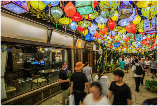 夜幕降臨,月光、燈光與水系、建築交相輝映,流光溢彩,亦真亦幻,遊人恍若步入了唯美夢幻的縹緲之境。景區用夢幻般的現代光影科技,創新詮釋傳統文化,打造出一場精彩紛呈的視聽饕餮盛宴。