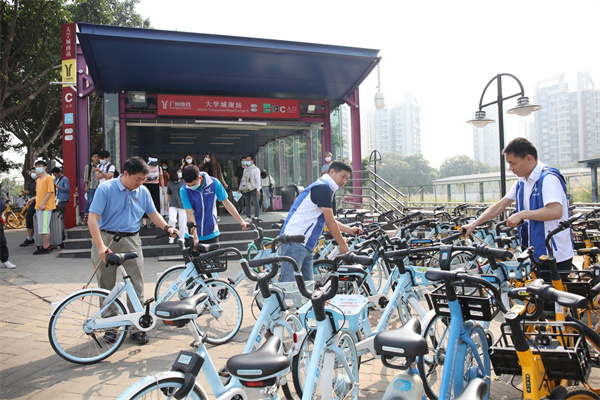 廣州地鐵建設總部和中交四航局的青年志願者們在大學城南站整理共享單車。曹鳳婷 攝
