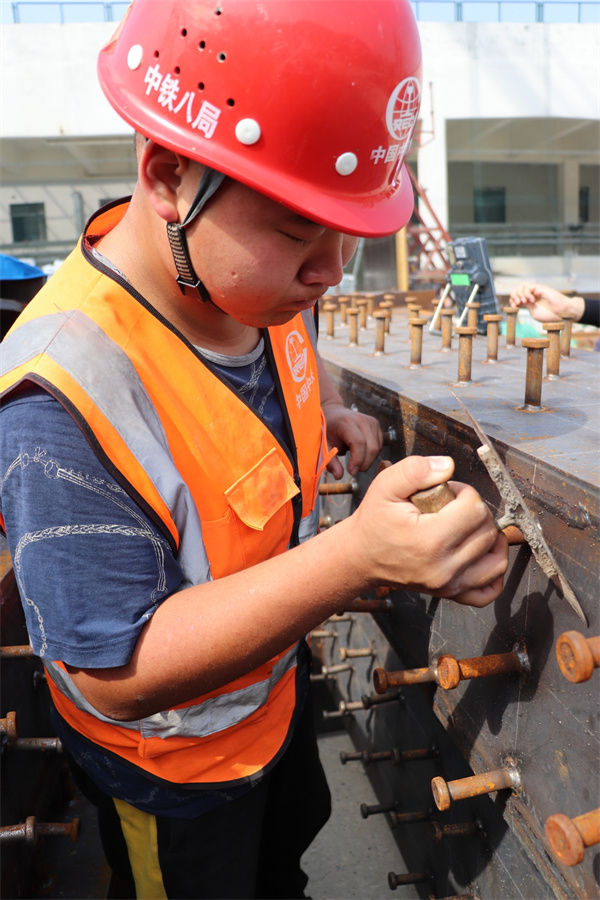 在廣州地鐵七號線二期水西北的施工現場,中鐵八局的年輕工程師高一寧在進行型鋼立柱無損檢測前焊渣清理。 朱亞輝攝