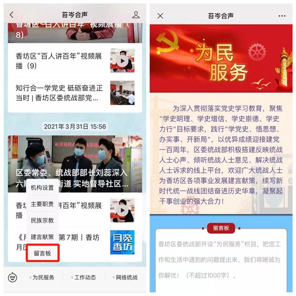 精準把握辦實事。區委統戰部準確把握開展黨史學習教育目標、基本要求和核心要義,進一步強化宗旨意識,立足突出統戰特色,把為統一戰線成員辦實事成效作為衡量黨史學習教育成果的重要標準,時刻把統戰人士的利益放在首位,把統戰人士的疾苦放在心上,並將工作重心下移,把觸角延伸到基層前沿陣地。經過緊張有序的設計調試,「為民服務留言板」於2021年3月24日正式上線。上線後,區委統戰部充分發揮留言板聯繫服務統戰人士的作用,及時在香坊區統一戰線微信工作群中發佈通知,面向全區統戰人士徵集「急難愁盼」問題,同時安排專人定時收集、梳理分類,並建立工作枱賬,實行「銷號」管理。根據「留言板」收集到的統戰人士訴求,及時轉交相關人員辦理,要求本部門能辦的事,第一時間辦理;一些需要溝通其他部門辦理的工作,第一時間轉交,並做好解釋說明工作。