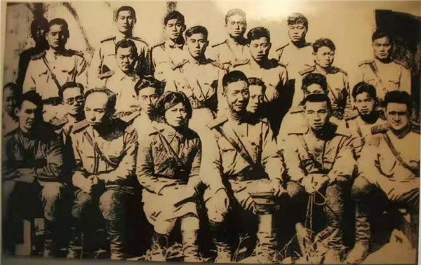 北野營部分人員合影-第一排左起:巴比奇。阿列克謝。尼基福維奇,張壽籛,王一知,周保中,金日成主席,什林斯基。季莫費伊。尼基托維奇。二排左起:張光迪,馮仲雲,王明貴,王效明,崔石泉,彭施魯。三排左起:楊海清,徐哲,姜信泰,金光俠,金鐵宇,隋長青。四排左起:安吉,朴德山,崔永進,陶雨峰,金京石。(攝於1943年10月5日)