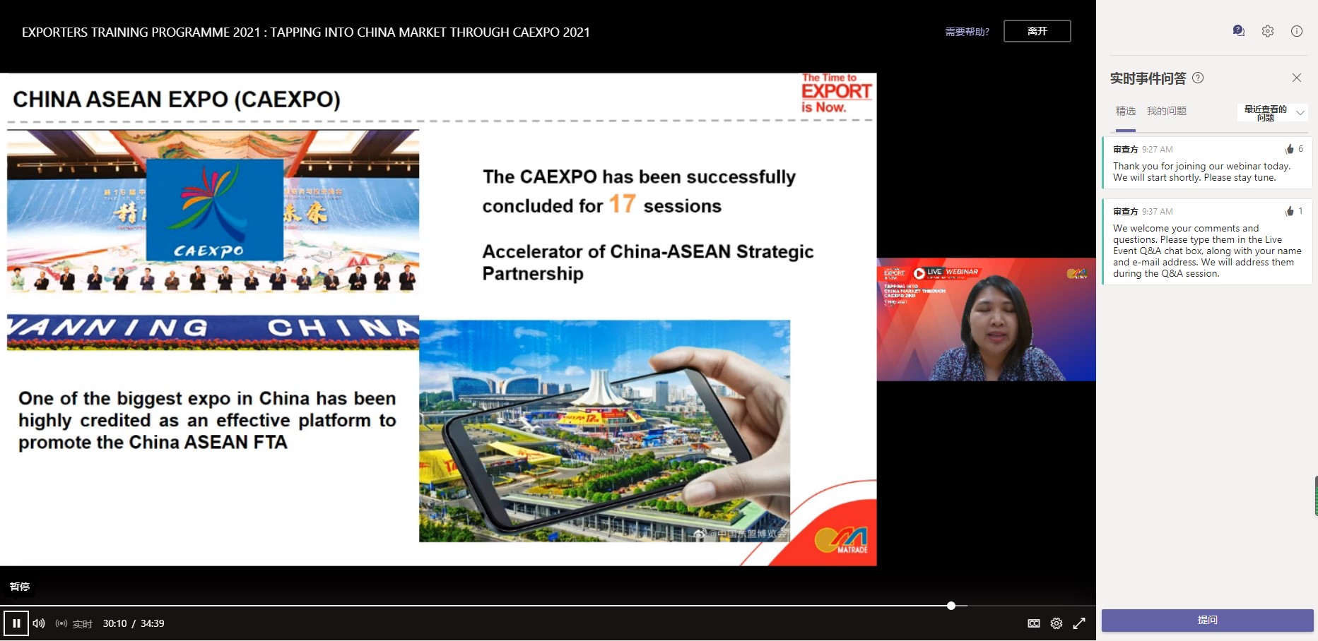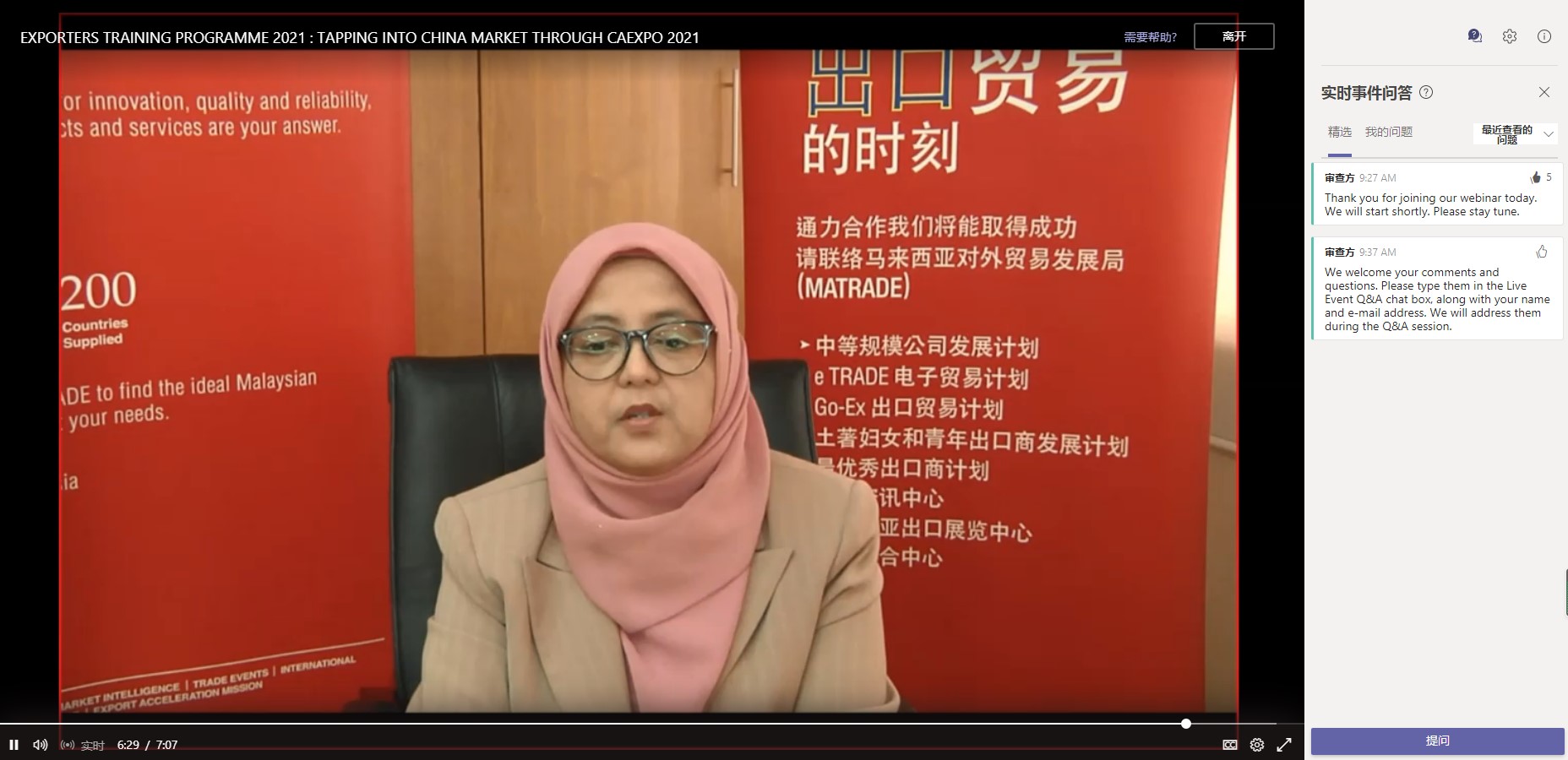 馬來西亞對外貿易發展局負責東博會事務的官員就第18屆東博會、中國建設銀行就配對平台、中國檢驗檢疫科學研究院馬來西亞特約服務中心就產品出口中國的相關檢驗檢疫政策等作詳細推介。會議還就企業代表入境參展參會、企業指定中國代理或合作機構參加實體展、雲上東博會的參展參會事宜、跨境金融服務及出口相關產品的檢驗檢疫標準等企業關心的問題進行了詳細解答,在線參會企業表現出強烈的參展參會意願。(徐玉瑩 陳芳)