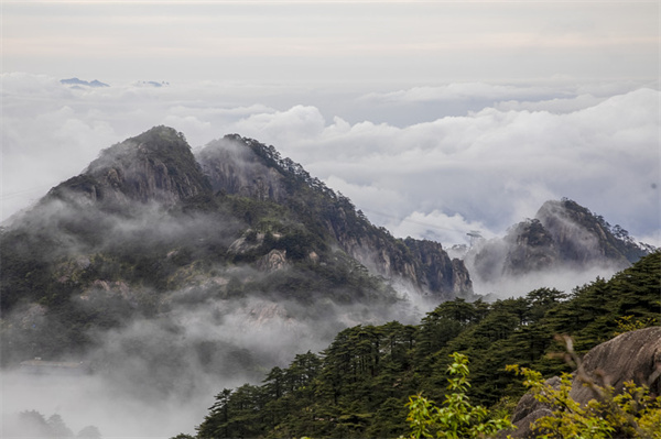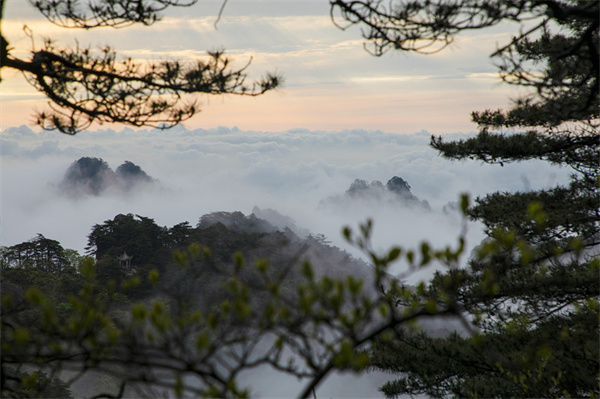 春季雨天的黃山,總有一種憂鬱而神秘的美,傍晚整座山都在雲霧之中,在上山的階梯中,透過層層樹枝,便能看到遠處頗有仙境味道的山峰,不由得對 黃山 的自然奇觀肅然起敬。