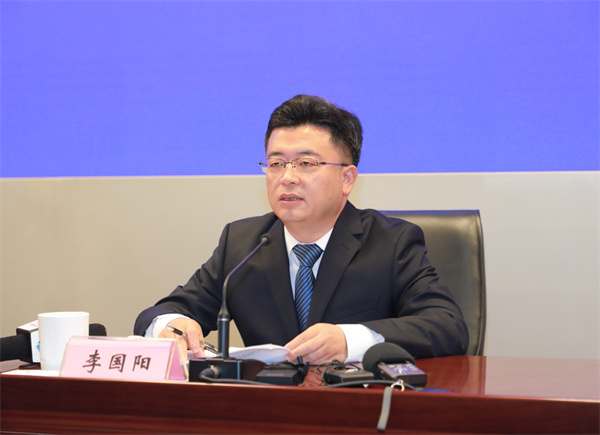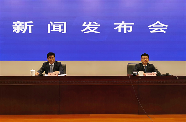 安徽省人民政府關於促進全省高新技術產業開發區高質量發展的實施意見新聞發佈會現場,安徽省委宣傳部新聞發佈處處長武瀟(左)主持發佈會,省科技廳副廳長李國陽介紹有關情況並回答記者提問(孫軍/攝)