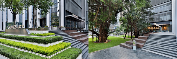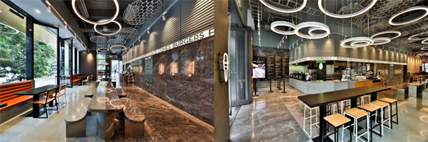 Shake Shack華南首店所在的萬象天地位於深圳創新科技的南山區,是當地重要的潮流時尚與新派餐飲地標。受萬象天地錯落有致的佈局啟發,Shake Shack以浮島為設計理念,以自然和科技為主題,利用不同色彩營造出充滿碰撞感又具有包容性的室內空間,同時藉助技術資源,創造出舒適的就餐環境,營造了一個溫暖而愜意的社區共享空間。餐廳的戶外空間溫馨而靜謐,一對老榕樹的存在更讓賓客產生在此地逗留休憩的念頭,而這裏的環境特點也讓人聯想到了Shake Shack位於麥迪遜廣場公園的首店。值得一提的是,餐廳主打的綠色元素如橋樑般連接起了室內外的空間,充滿溫暖感的皮革長椅、有着光滑切線的綠色大理石地磚、綠色水磨石和不鏽鋼的碰撞組合,為Shake Shack萬象天地店帶來了具現代感的微妙平衡。