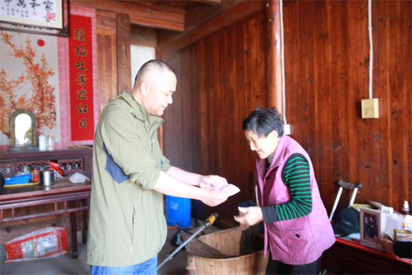 桃子阿姨拿到錢時,激動不已,一生無兒女的她看著房保林,飽含淚水,是小房帶給了他們這個家無盡的溫暖與感動。隔壁郭村的詹老太太今年93歲了,是桃子阿姨的至親,聽聞房書記幫了家裏這麼大的忙,一口氣走了8裏山路,帶著家裏一大籃土雞蛋,硬要塞給房書記。