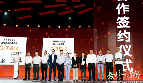 在当日推介會現場,江西省推出的景德鎮市樂平塔前溫泉小鎮项目、萍鄉市武功山雲祥文旅綜合體项目等12個重大旅遊项目受到各界客商青睞,成功簽署了合作協議,協議投資總金額逾500億元。(周萬里)