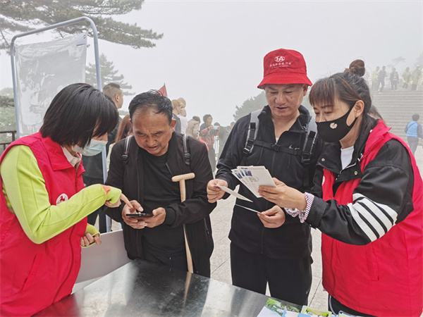 當天,30名旅遊志願者走進新國線、天海、西海、玉屏樓等片區,提醒遊客佩戴口罩保持間距,為遊客提供諮詢講解服務,並開展“黃山郵你更文明”有獎線上問卷調查活動。