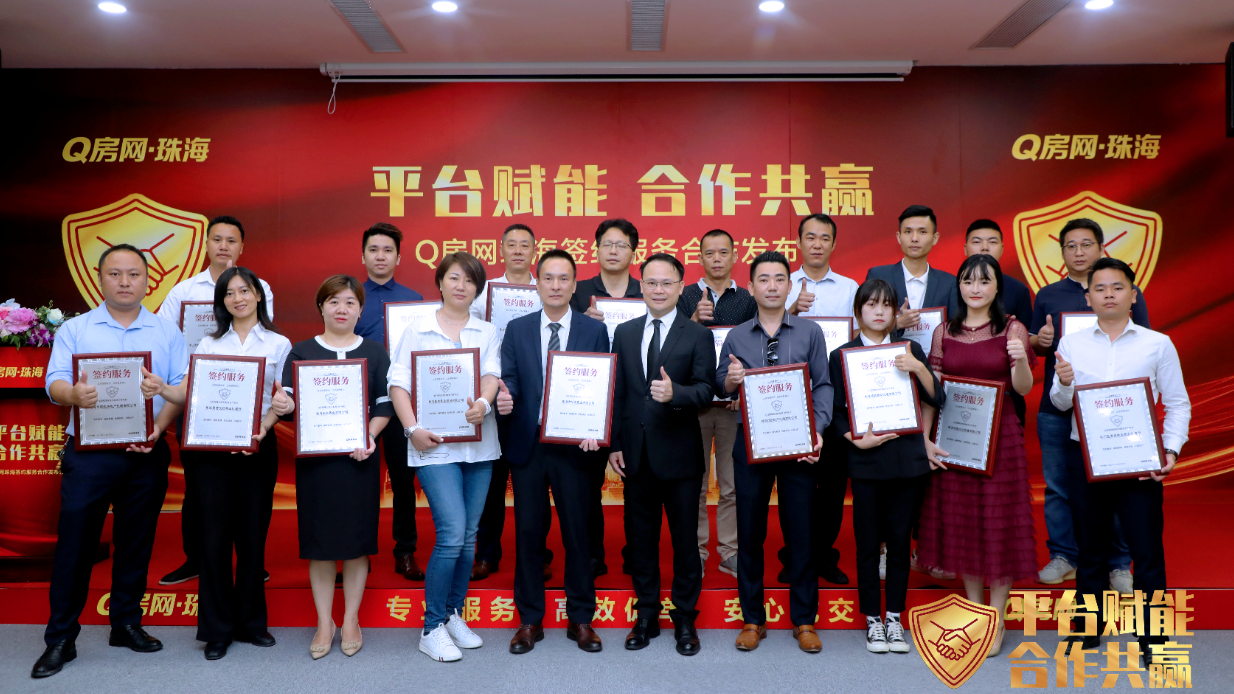 5月19日,「平台賦能 合作共贏 --- Q房網房產交易簽約中心簽約開放服務」合作發佈會暨簽約儀式在Q房網珠海總部舉行,華江、璟揚、桓業、傳城、鼎信築夢房地產代理公司等20餘家企業獲得授權牌照,共同開啟Q房網一站式房產交易簽約服務的服務新模式。