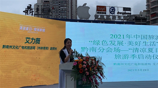 活動當天,黔南州文化廣電和旅遊局(州體育局)副局長艾力薇做了現場推介並現場發佈了黔南夏日旅遊、紅色旅遊精彩內容及優惠政策。 綠博黔南,康養之州,美在生態,貴在幸福。黔南是一座風景奇秀的世遺之城,這裏的山川孕育着大自然的神奇魅力,令人心馳神往;黔南亦是一座多元的民族之城,熱情好客的各族群眾和多姿多彩的民族文化在這裏相交相融、生生不息;黔南還是一座尋秘探奇的天文之城,「中國天眼」讓您帶着無限遐想進入奇幻無窮的奧妙星空;黔南更是一座不忘初心的紅色之城,這裏的大地鐫刻着共產黨人的激盪情懷!