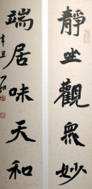 記者看到,本次展出的作品皆為中小尺幅,以楷書對聯為主。作品中的字端莊大氣,樸茂峻拔,氣象渾穆,同時又展現出澄明通透,靜中生動,神采飛揚的氣韻,具有很強的審美感染力。常弘才介紹,展名 " 靜味天和 " 化用自他工作室牆上的一幅對聯:" 靜坐觀眾妙,端居味天和 "。他說:" 靜坐和端居是平和安定從容自然的狀態,一個藝術家只有讓心神和靈魂安定下來,才能觀察到天地間的大美、玄妙和天機。"