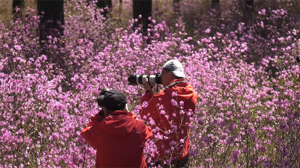 攝影愛好者石玉海高興的告訴記者,拍到了期待的美景,「每年鷗浦達子香花開的時候,我們都會到這裏來拍攝賞花,今年因為天氣的原因,達子香花兒開的晚了幾天,我們相約攝影人來到了鷗浦,來看這裏,到這裏看花賞花,你看這株白色的達子香花兒特別的漂亮,也特別的罕見阿,歡迎大家來鷗浦進行打卡,也歡迎大家都來鷗浦的達子香花兒,花海來觀光旅遊。」