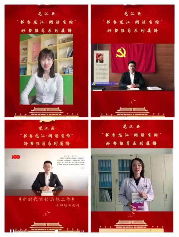 好書推薦示範引領。龍江縣向全縣廣大幹部群眾、青少年朋友們發出倡議,倡導全民閱讀風尚,提高全縣幹部群眾閱讀熱情,營造全縣人民愛讀書、讀好書、善讀書的濃厚氛圍。縣委宣傳部率先錄製好書推薦小視頻掀起全縣讀書分享熱潮,14個鄉鎮、60家機關企事業單位同步精心錄製好書推薦視頻67個,在縣電視台、「印象龍江」抖音官方平台陸續展播。截止目前,展播視頻在全縣100餘個微信群、網格群轉發,瀏覽量共計2萬餘次。結合當前黨史學習教育,組織開展紅色經典讀物閱讀活動,使全縣幹部做到學史明理、學史增信、學史崇德、學史力行。