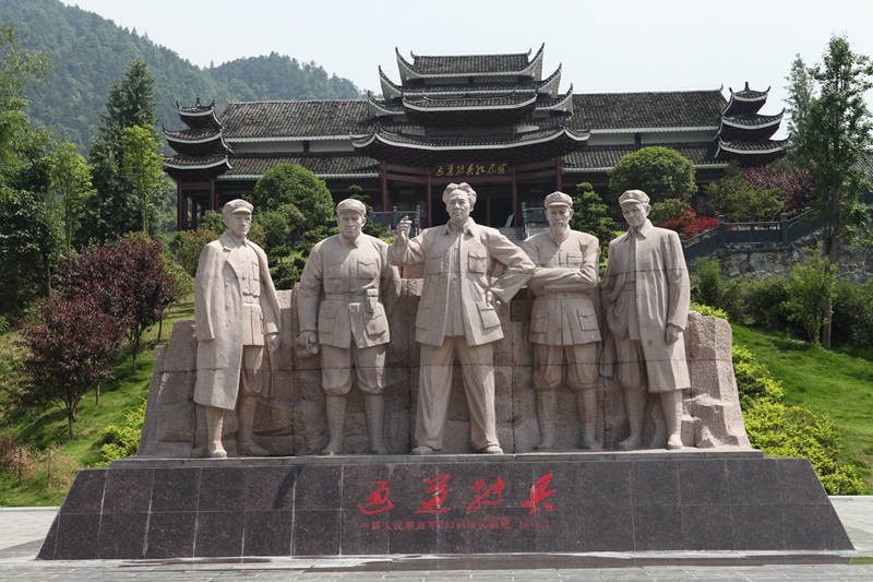 1934年底,長征初期,三萬紅軍來到湖南通道縣境內。毛澤東以其睿智的軍事洞察力,在緊急召開的通道會議上力挽狂瀾,從而使紅軍放棄北上的原定方針,改向敵人力量薄弱的貴州進軍,實現了戰略突圍,取得戰略轉移的主動。這次轉兵史稱「通道轉兵」。通道轉兵紀念館前的五雕塑,記錄了1934年紅軍中央軍過通道時,毛澤東、朱德、周恩來等人在通道時的場景。