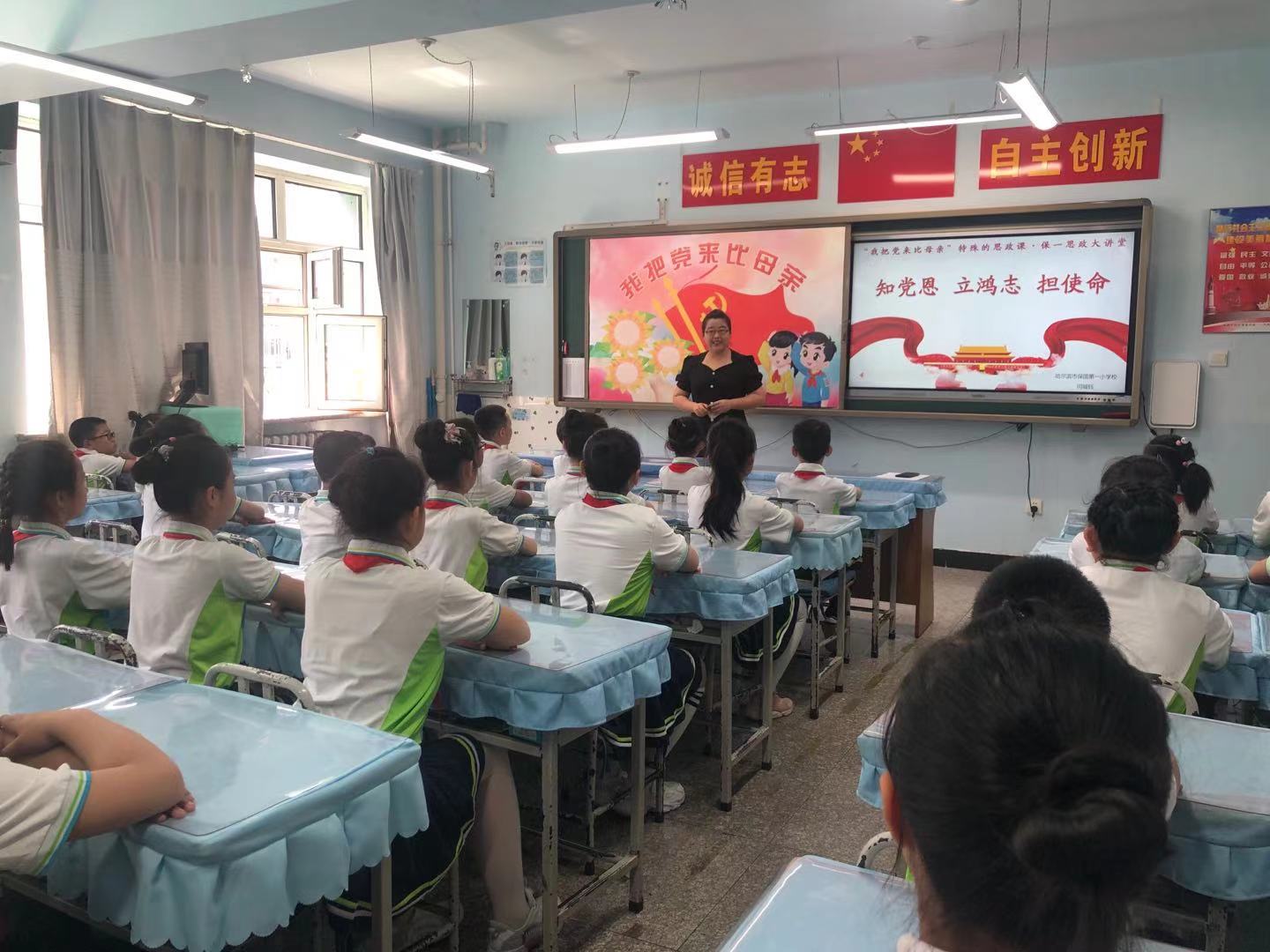 黨史學習教育啟動以來,哈市平房區立足教育實際,把上好思政課、幫助青少年兒童「扣好人生第一粒扣子」作為黨史學習教育的一項重要內容,組織全區思政課教師開展專題學習培訓和思政微課大賽,打造了一批知史愛黨、知史愛國的精品思政課。為讓思想課更加具有親和力和感染力,讓學生尤其是低年級學生容易聽得懂、記得牢,還將思政課拓展開來,在課堂上、家庭中開展「我把黨來比母親」主題宣講活動,讓全區師生和家長同上一堂「特殊的思政課」。