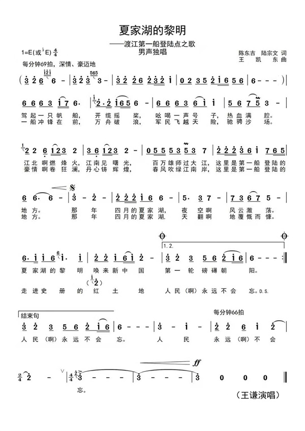 《夏家湖的黎明——「渡江第一船」登陸點之歌》歌詞抒情豪邁,高亢激盪,講述了「百萬雄師過大江」英勇悲壯的歷史故事,詮釋了共產黨人不忘初心、向死而生的鐵膽忠誠。其曲調結構嚴謹,音域適中,音樂主題融入蕪湖民歌《唱山歌》旋律元素,韻律扣人心扉,具有一定的時代性和藝術感染力。