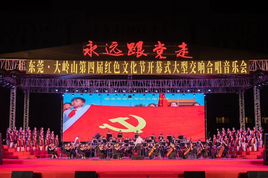 莞邑大地歌聲亮,初心不忘跟黨走。25日晚,萬眾期待的「永遠跟黨走」東莞·大嶺山第四屆紅色文化節開幕式大型交響合唱音樂會在廣東省東莞市大嶺山鎮文化廣場舉行。來自省合唱家協會、省音樂家協會、省青年美術家協會及東莞市和大嶺山鎮的各界人士共約3000人參加,音樂會讓廣大民眾零距離接觸高雅藝術,用經典音樂回顧黨史,用紅色歌曲學習黨史。