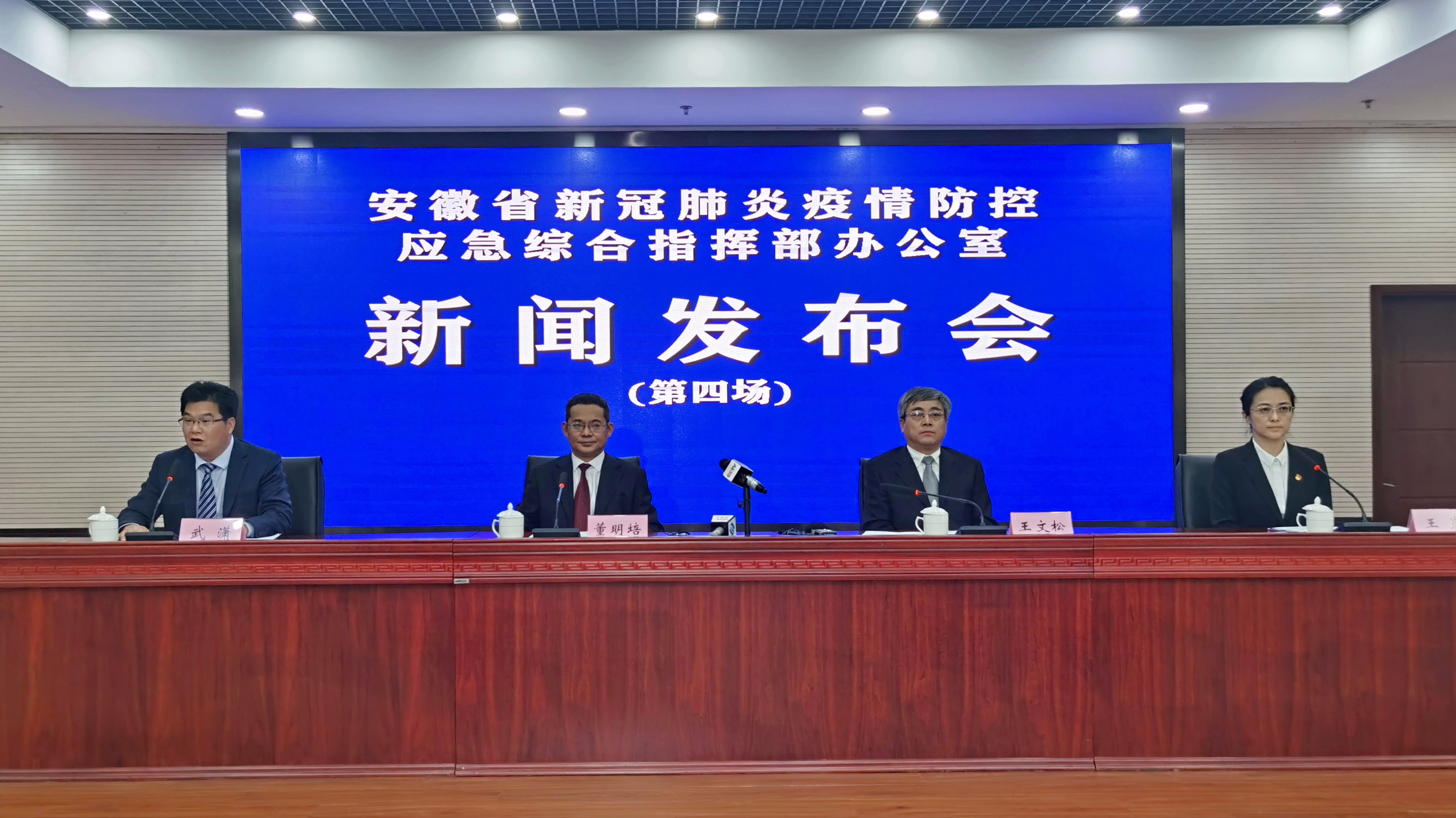 安徽省新冠肺炎疫情防控應急綜合指揮部辦公室新聞發佈會(第四場)現場,左起:安徽省委宣傳部新聞發佈處處長武瀟主持發佈會,省衛生健康委副主任、省中醫藥管理局局長董明培,合肥市委常委、常務副市長王文松,六安市副市長王嵐,先後介紹有關情況,並回答記者題問(孫軍/攝)