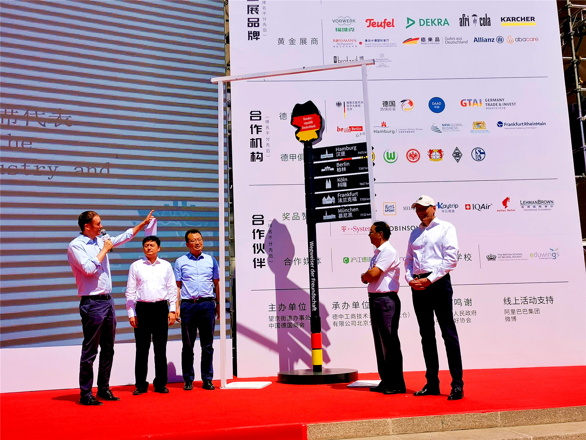 開幕式上,前中國駐德國大使史明德,中國德國商會主席、大眾汽車集團(中國)行政總裁馮思翰,德國工商大會北京代表處首席代表晏思,朝陽區委常委、組織部部長遲行剛,朝陽區委常委、常務副區長崔小浩等領導共同為中德友好「零距離指向標」揭幕。「零公里」標誌是一個國家或者城市幹線公路的象徵性起點,也是一個城市中心點的象徵,此次揭幕的「零距離指向標」頂部為聯邦德國標誌,主杆位置上刻寫了「中德友好『零距離』指向標」字樣,並按照德國各城市的地理位置自上而下(地理上自北向南)標註北京到各城市的直線飛行距離。「作為北京與德國友好的象徵,這個指向標就是友誼起點的象徵,寓意友誼從此地出發,越來越近。」晏思表示。