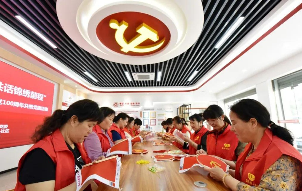 活動中,來自安徽省巢湖市益樂愛心社的黨員、社員,和金碼頭社區老黨員及志願者圍坐在一起,手捧鮮艷的旗幟,專註、莊重地綉下針腳,把愛黨、敬黨的濃濃情感融入親手綉制的黨旗之中。在熟練的飛針走線中,來自社區的老黨員,情不自禁哼唱起紅色經典歌曲,現場氛圍暖心十足。