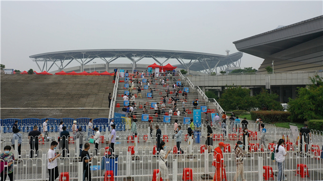 21日,攝製組來到奧體方艙時,早已有市民在排隊等待進入。據筆架山街道城市管理部的葛芙蓉介紹,之前幾天有很多市民在凌晨4點多就來排隊,接種疫苗的積極性非常高。