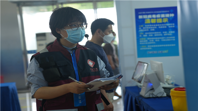 荷葉地街道志願者劉偉總是面帶着笑容,指導市民到排隊人數少的隊伍登記接種疫苗,忙碌的時候,連喝一口水的時間都沒有。力所能及的事情,所有志願者都會搶着做,他們非常敏銳,在嘈雜的接種廳內,接種市民的一句話他們總會立即反應,四處奔走。像劉偉這樣的志願者每天都有30多人,他們穿着紅馬甲在3000平米的接種點內隨時待命,隨處可見。