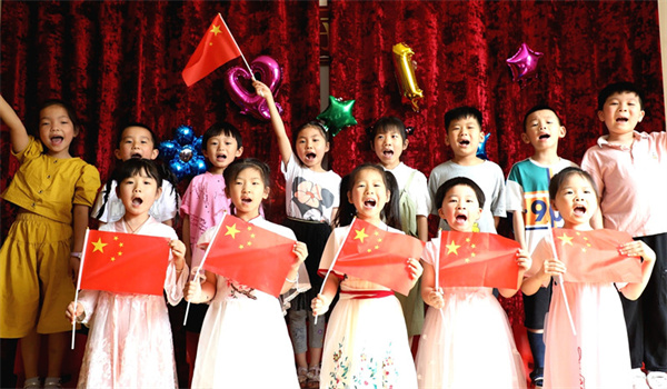 6月1日,安徽歙縣楓韻少兒服務中心班級小劇場熱鬧非凡,小朋友們在演唱《紅星照我去戰鬥》。