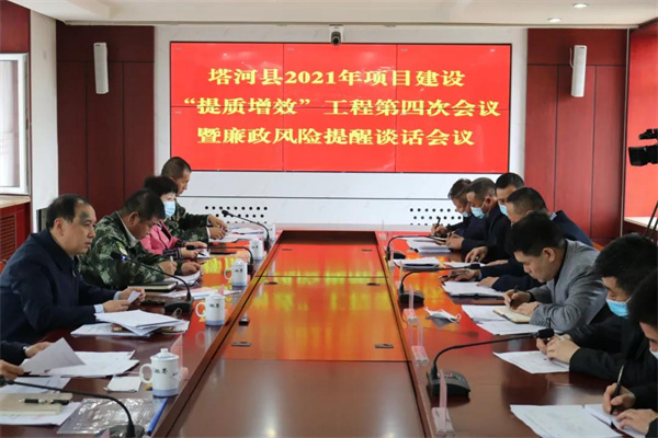 日前,黑龍江省塔河縣2021年項目建設「提質增效」工程第四次會議暨廉政風險提醒談話會議在縣委四樓會議室召開,塔河縣委書記林建軍、縣長宋波出席會議並講話,縣委常委、副縣長張躍科,副縣長劉淑艷 、鄂旭傑、劉煜及項目、財經相關單位負責人參加會議。