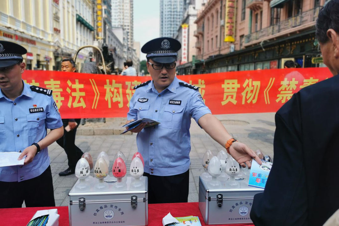在道里區中央大街,來往人流熙熙攘攘,在禁毒宣傳台上擺放着不同顏色的仿真毒品,吸引了很多遊人的目光。道里禁毒辦向來自全國各地的遊客發放禁毒宣傳品和講解圖冊,介紹毒品危害,講解防毒知識,提高群眾防毒意識。