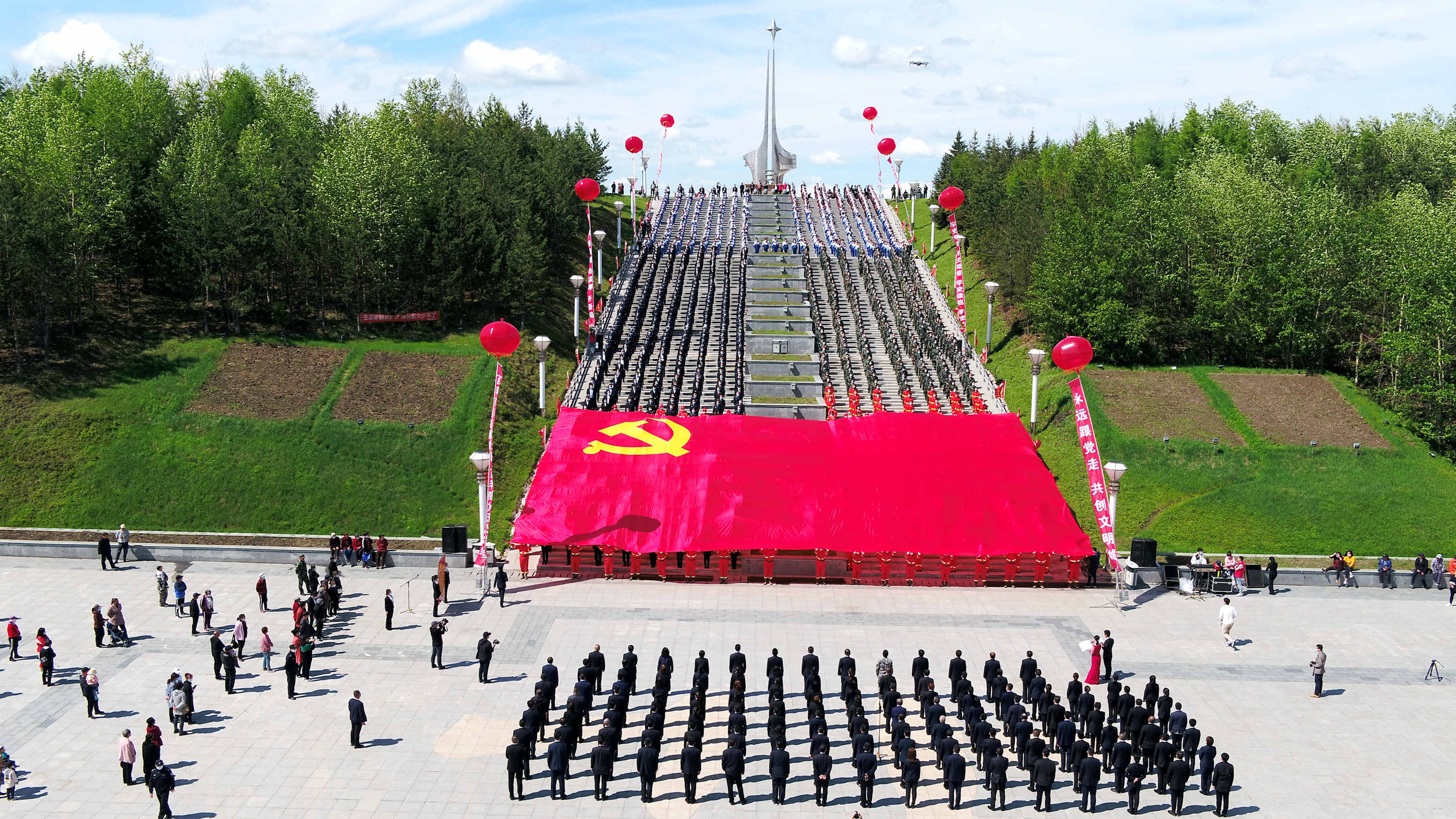 伴隨着激昂的樂曲,一面400平方米的巨幅黨旗在祖國的大地上緩緩展開,面向鮮紅的黨旗,在場的黨員幹部和居民群眾心潮澎湃。100名黨員整齊列隊,在領誓人的帶領下舉起右拳,莊嚴宣誓,重溫入黨誓詞,回望入黨初心,抒發對黨忠誠的意志和信念,更加堅定了黨員幹部的初心和使命。